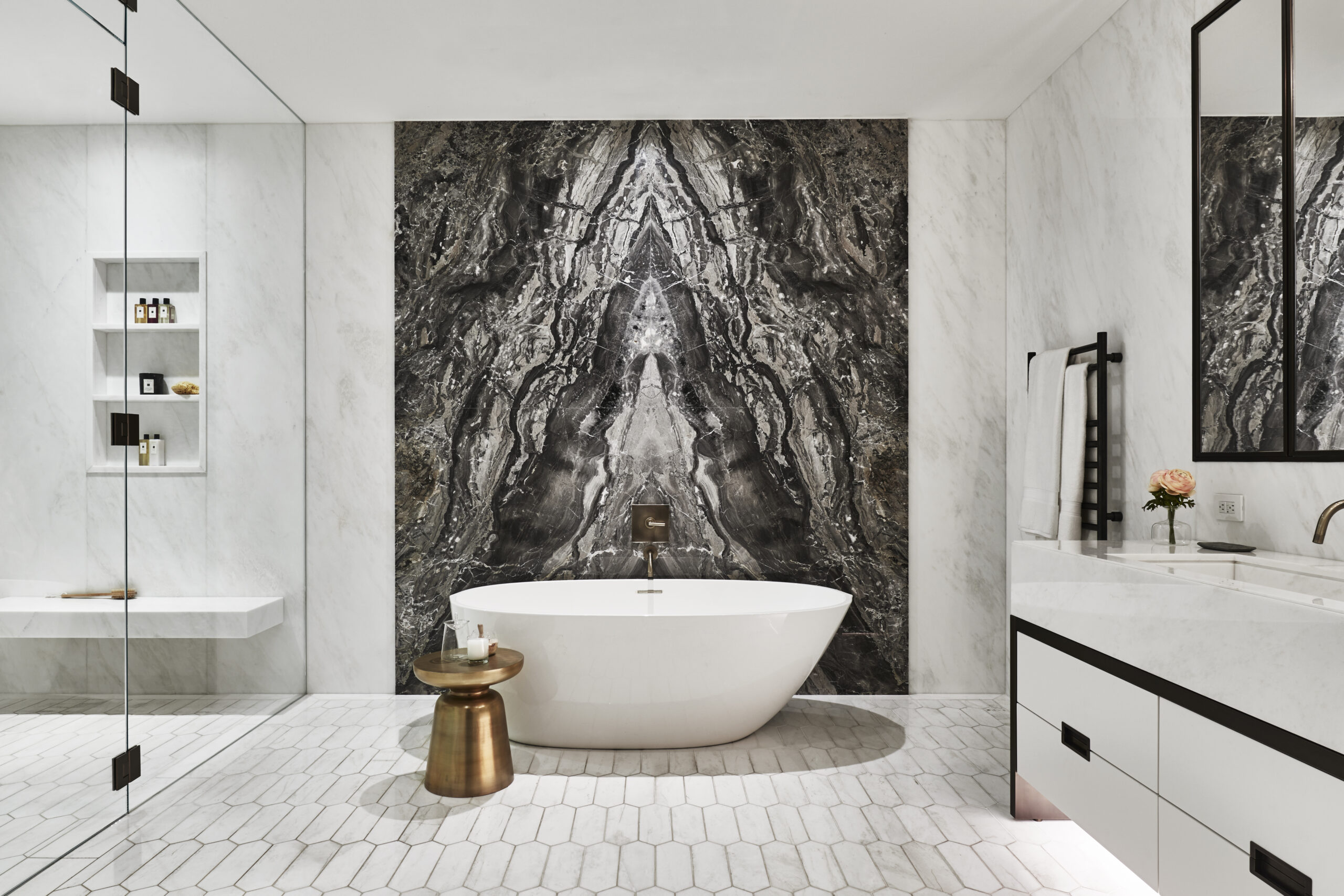 Residences feature dual dishwashers, a 70-bottle wine fridge, and cappuccino cup warming drawers, with baths anchored by dramatic marble and freestanding tubs.